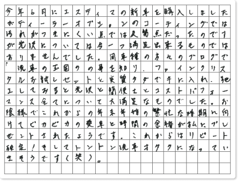 今年6月にエスティマの新車を購入しましたがディーラーオプションのコーティングでは汚れがつきにくい点では 及第点だったのですが光沢については今一つ満足出来るものではありませんでした。
