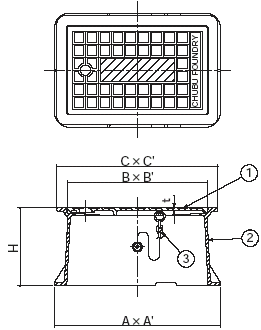 材質 1フタ:FC200(CSコート) 2枠:FC200(CSコート) 3クサリ:SS400(ユニクロメッキ) 寸法 A:320mm A':220mm B:270mm B':170mm C:310mm C':210 H:150mm t:3.5mm 散水栓の呼び径13〜20mm フタ質量1.9kg 総質量7.9kg ※写真は散水栓BOXです。