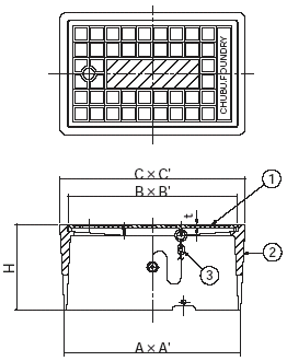 材質 1フタ:FC200(CSコート) 2枠:FC200(CSコート) 3クサリ:SS400(ユニクロメッキ) 寸法 A:310mm A':200mm B:297mm B':187mm C:326mm C':216 H:150mm t:3.5mm 散水栓の呼び径13〜20mm フタ質量2.1kg 総質量10.7kg ※写真は散水栓BOXです。
