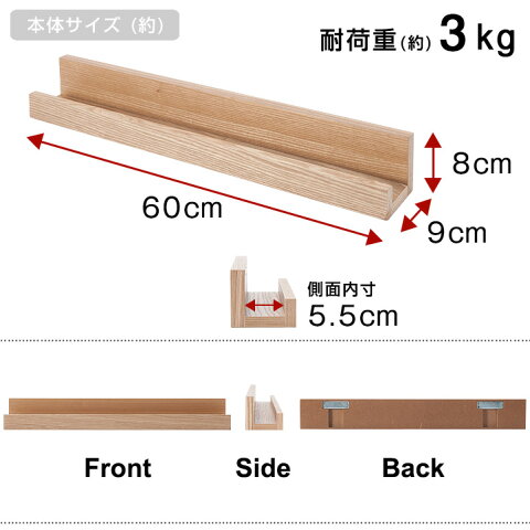 商品スペック 商品名/型番 ウォールシェルフ 壁掛け飾り棚ナチュラルNKB-M60NA、ブラウンNKB-M60BR サイズ (約)幅60×奥行9×高さ8cm 耐荷重 約3kg(下記の詳細参照) 素 材 本体:天然木化粧、繊維板 表面塗装仕上げ ラッカー塗装 JANコード NKB-M60NA:4549813872092 NKB-M60BR:4549813872108 セット内容・付属品 本体×1、専用フック×2、取り付け部×4(予備×1)、キャップ×4(予備×1)、固定ピン×12(予備×3)、ネジ×4(予備×1)、取り付け用定規×1 メーカー/ブランド ドウシシャ 耐荷重について ※耐荷重の目安:文庫本15冊程度で3kgになります。